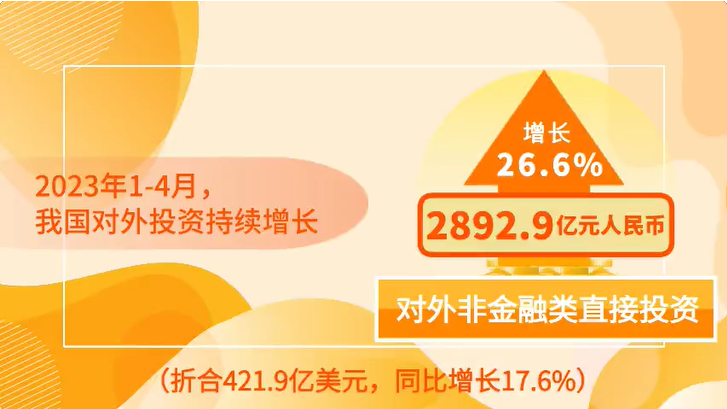 2023年1-4月,我国对外投资持续增长,对外非金融类直接投资2892.9亿元人民币,同比增长26.6%(折合421.9亿美元,同比增长17.6%)。我国企业在“一带一路”沿线国家非金融类直接投资75.3亿美元,同比增长9%,占同期总额的17.8%。