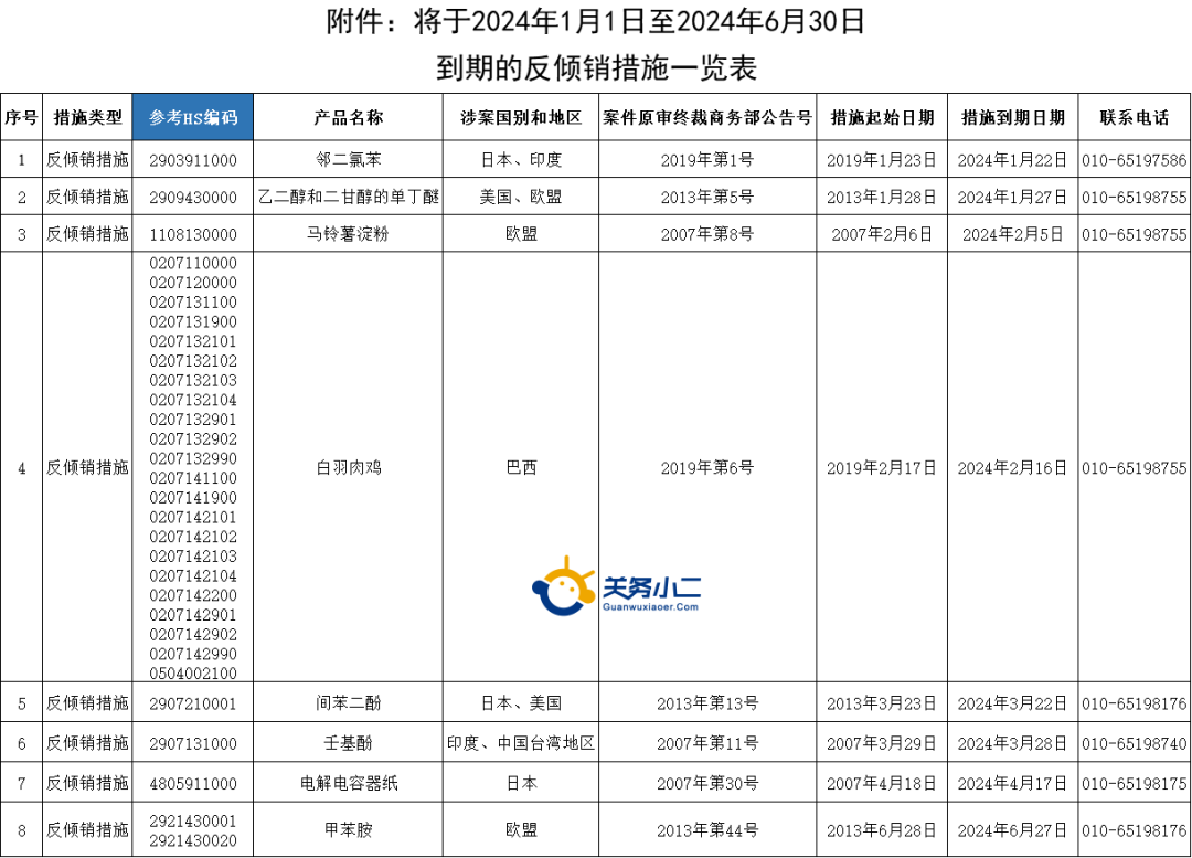 附件:将于2024年1月1日至2024年6月30日到期的反倾销措施一览表