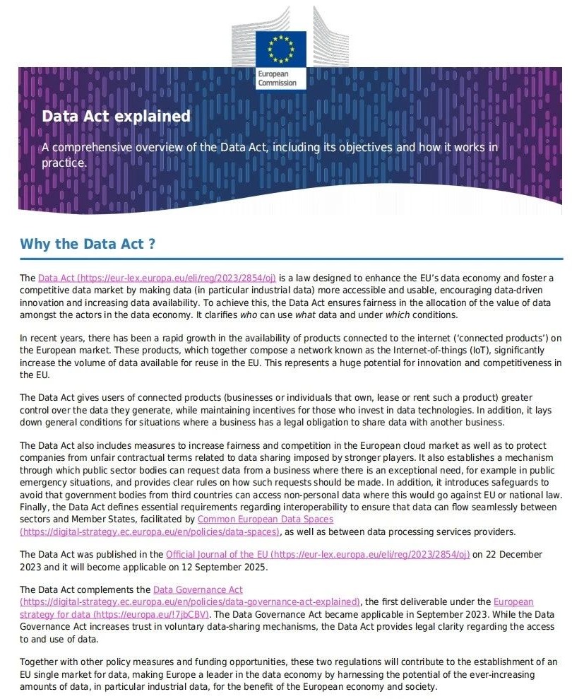 近日,欧盟委员会在其官方网站发布了《数据法》(The Data Act)指南,该指南进一步明确了《数据法》实施过程中的各种细节。