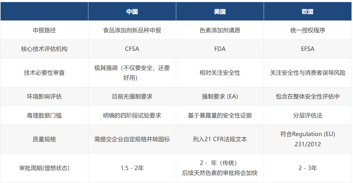 四、核心对比:中美欧新食品色素准入要求差异